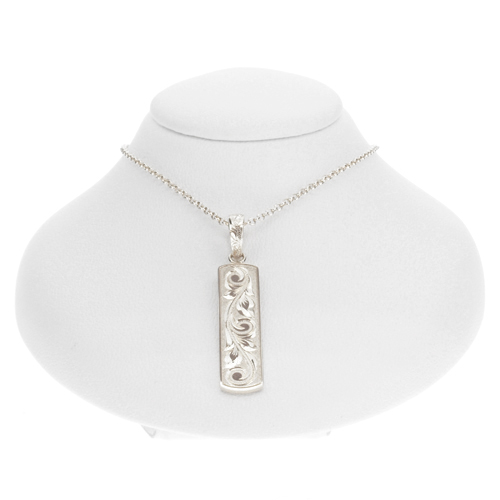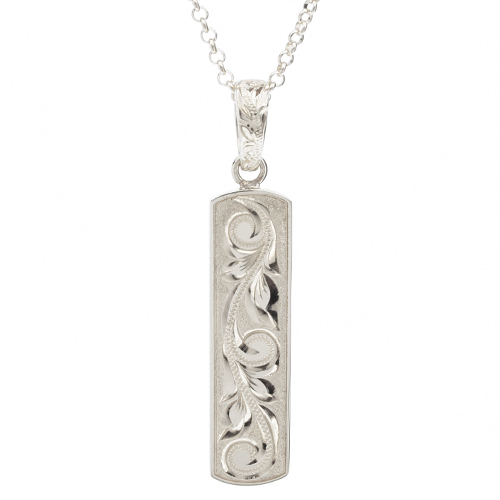 幸せを絶え間なく呼び込む‘スクロール(波)’と、神聖なる絆を表す‘マイレリーフ(マイレの葉)’を合わせた‘オールドイングリッシュ’という柄を、ハワイアンエアルームジュエリー独特の‘浮き彫り(レイズド)’という手法で掘り込んだペンダント。