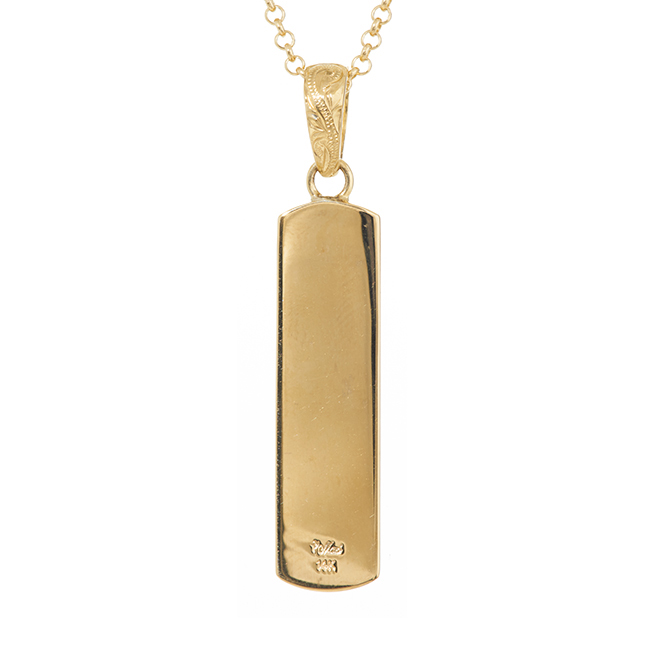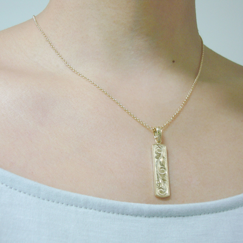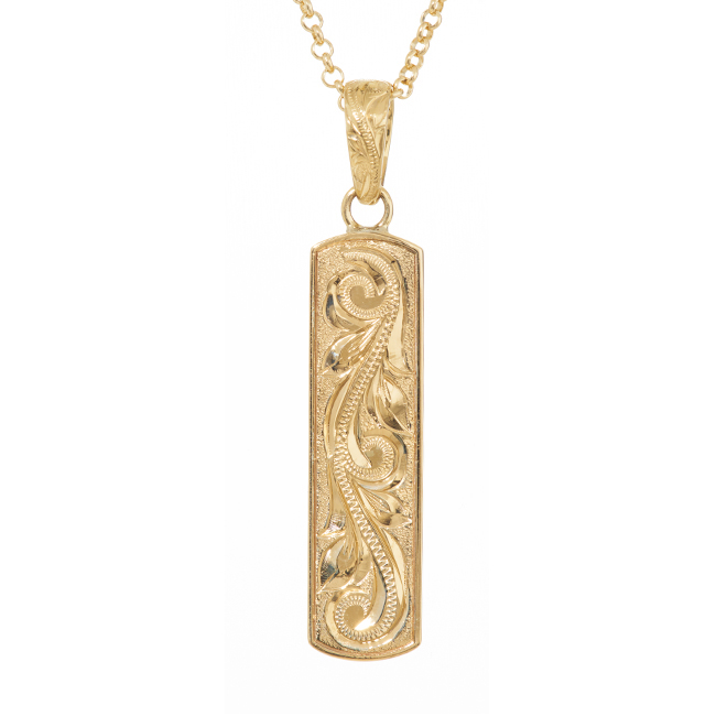 幸せを絶え間なく呼び込む‘スクロール(波)’と、神聖なる絆を表す‘マイレリーフ(マイレの葉)’を合わせた‘オールドイングリッシュ’という柄を、ハワイアンエアルームジュエリー独特の‘浮き彫り(レイズド)’という手法で掘り込んだペンダント。