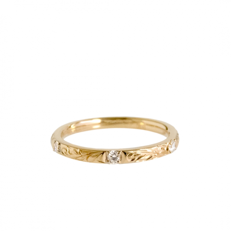 バレルデザインでカジュアルなドットのダイヤモンドを3石使用したエンゲージメントリング(婚約指輪)です。