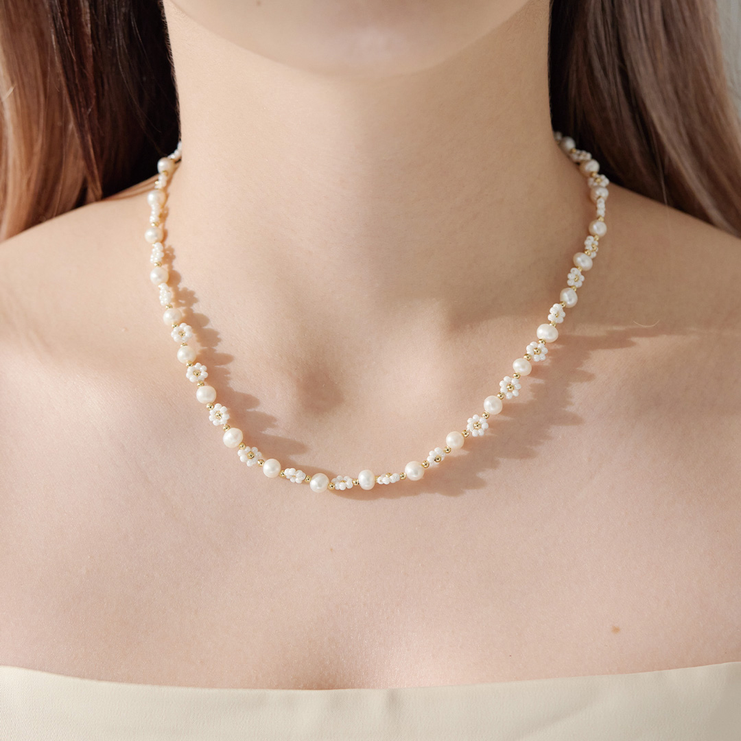 華やかなデザインが魅力のパールフラワーネックレス。一つ一つの花のディテールや、きらめくパールが上品なアクセントとなるハワイアンジュエリーネックレスです。長さ調節可能なチェーンが付いているので、好みの長さでお楽しみいただけます。